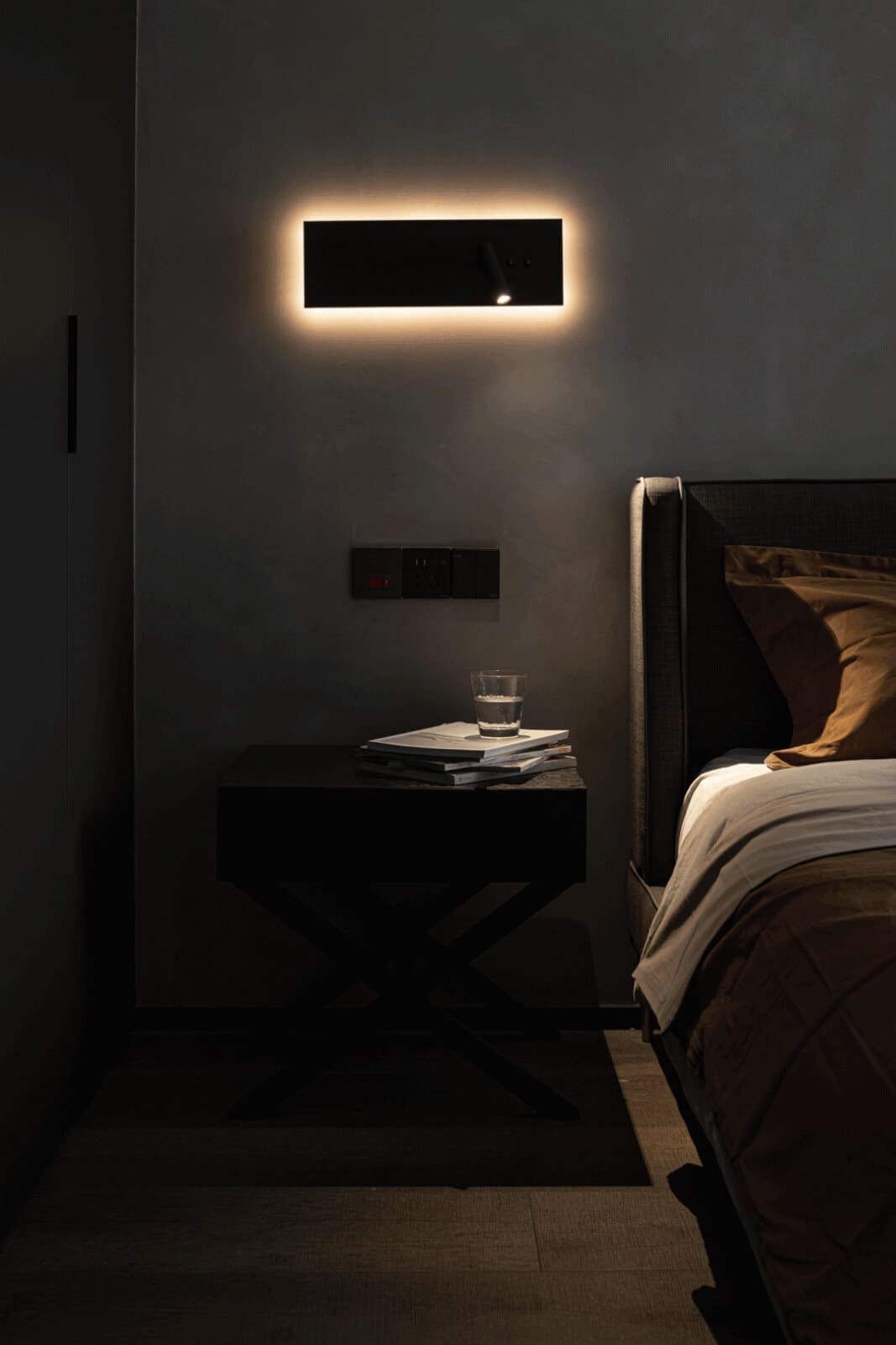 The dark fabric and the dark bedside table set off the cement paint wall background to give the bedroom a sense of tranquility. The combination of the small bronze chandelier and the mottled metal ornaments makes the bedside more fun and exquisite. feel. The moment I opened the door of the master bedroom, my whole heart was relieved; the simple and comfortable feeling hits, I can’t help but fall in love with this simple and warm and not messy nestCement paint, matte wardrobe, linen-like headboard, different levels of The presentation of gray-scale colors and its own texture, coupled with the richly colored bedding, continues the design framework of the living room, avoids the single color of the space, and also adds a touch of warmth to the master bedroom. The wall lamp and small chandeliers at the bedside make the space One more sentiment.